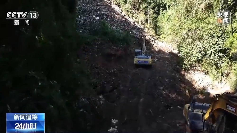 总台央视记者 陈允涛:在山谷的谷底,从这儿可以更清楚地看到剖面,我们得知比想象中的更陡峭,将近有80度左右。我面前的这些垃圾经过十几年左右的堆放,一些垃圾慢慢的开始分解,现场也能闻到刺鼻的味道。挖掘机遇到了一个新的问题,在施工的过程中发现有块巨石有松动的风险。实施工程人员准备上去安装雷管,爆破之后再进行作业。